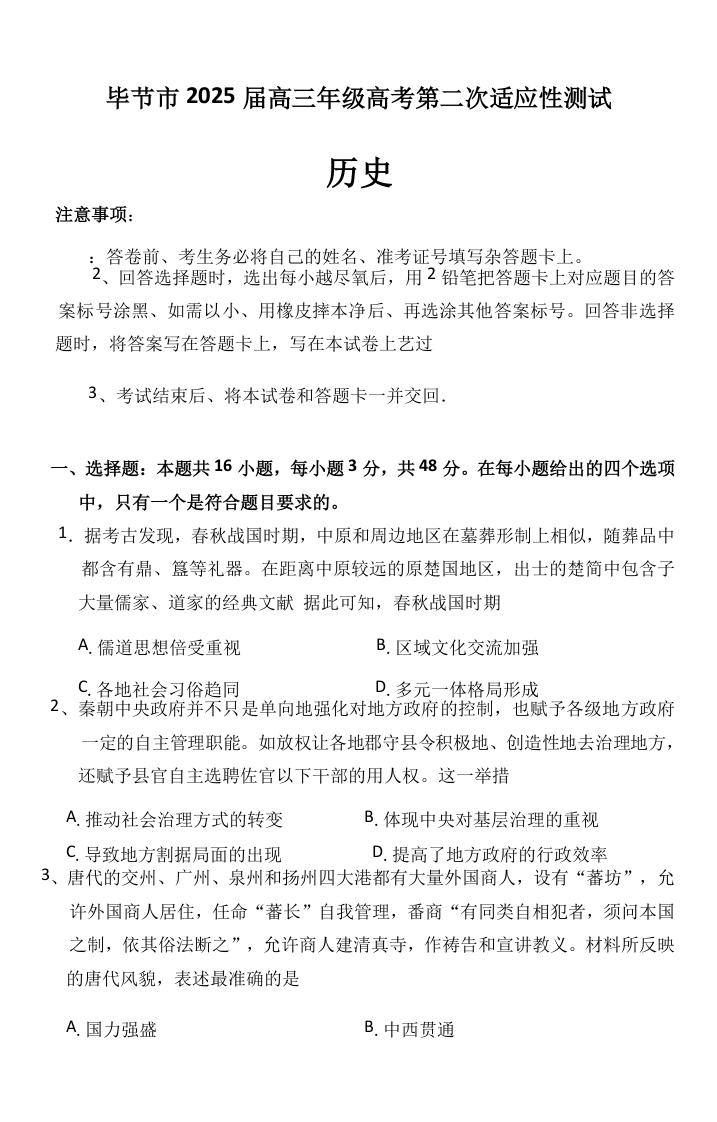 贵州省毕节市2024-2025学年下学期3月高三二诊统考历史