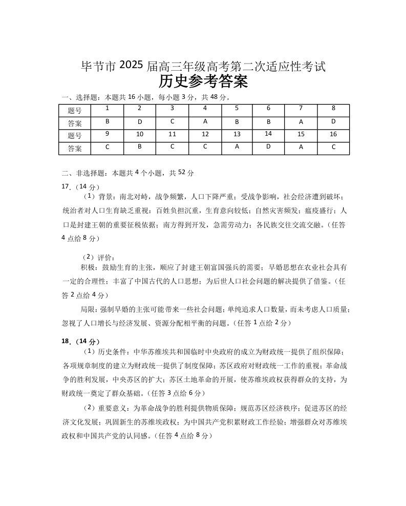 贵州省毕节市2024-2025学年下学期3月高三二诊统考历史答案
