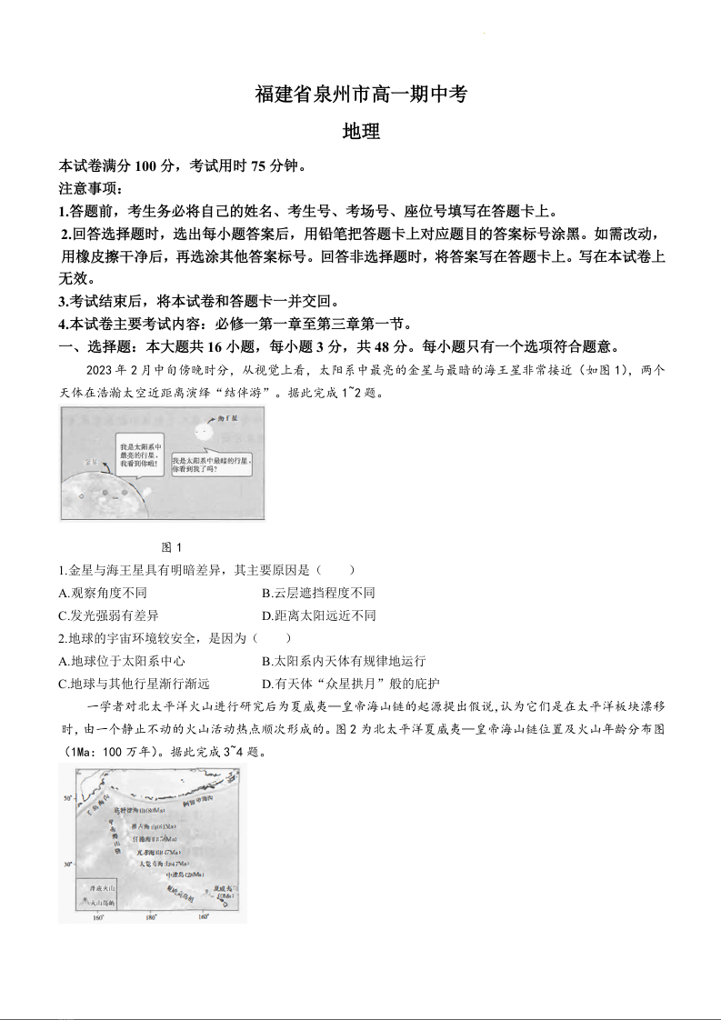福建省泉州市2023-2024学年高一上学期11月期中考试地理
