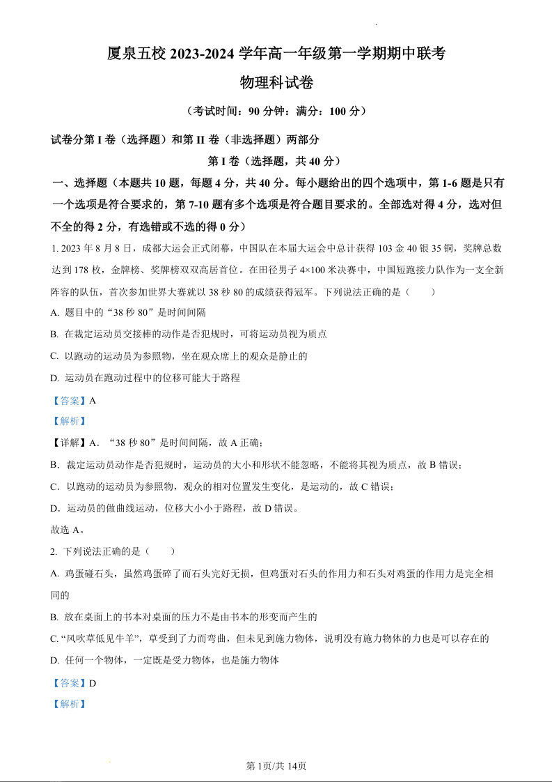 福建省夏泉五校联考2023-2024学年高一上学期11月期中考试物理(精品解析版)
