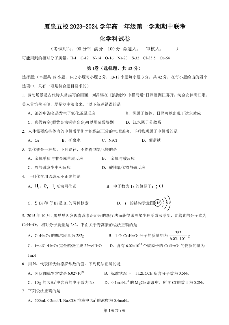 福建省夏泉五校联考2023-2024学年高一上学期11月期中考试化学