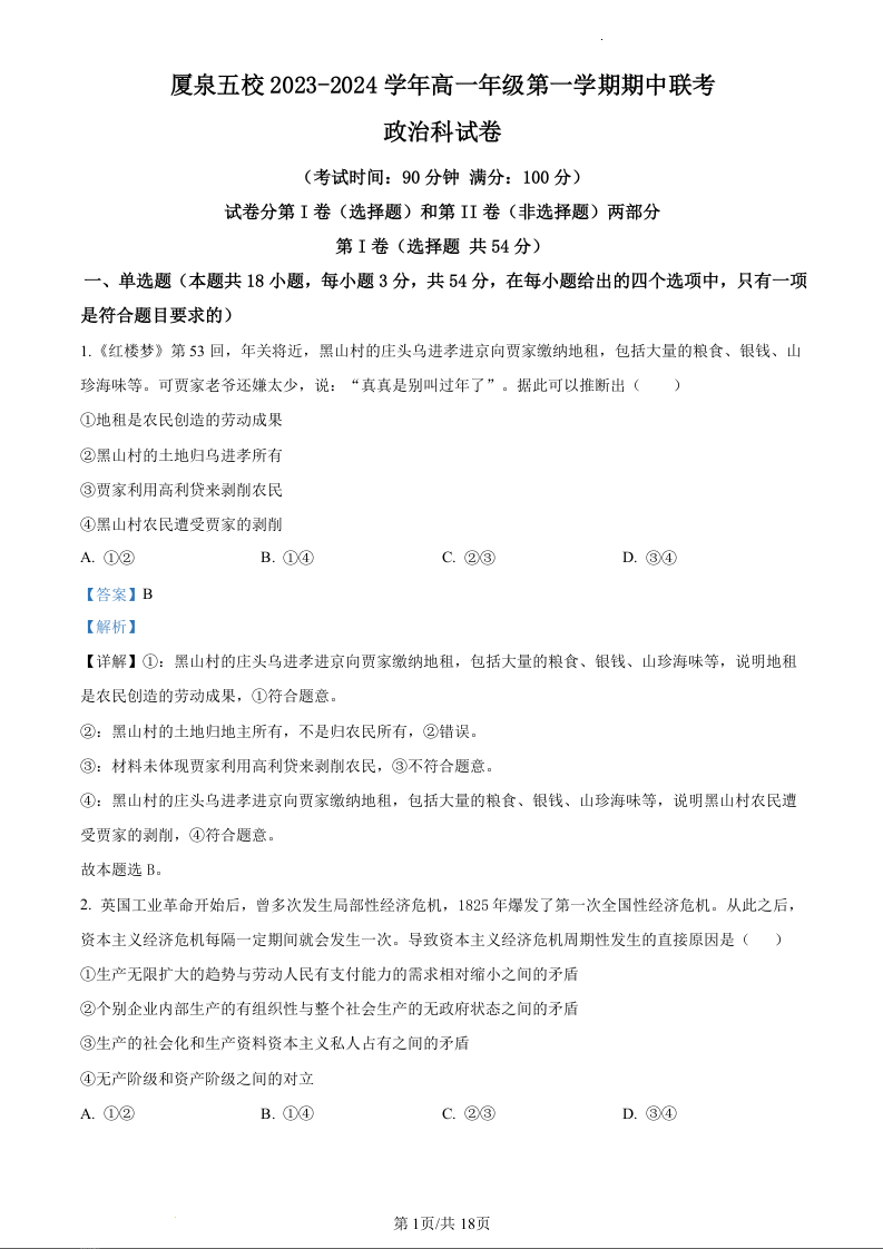 福建省夏泉五校联考2023-2024学年高一上学期11月期中考试政治(精品解析版)