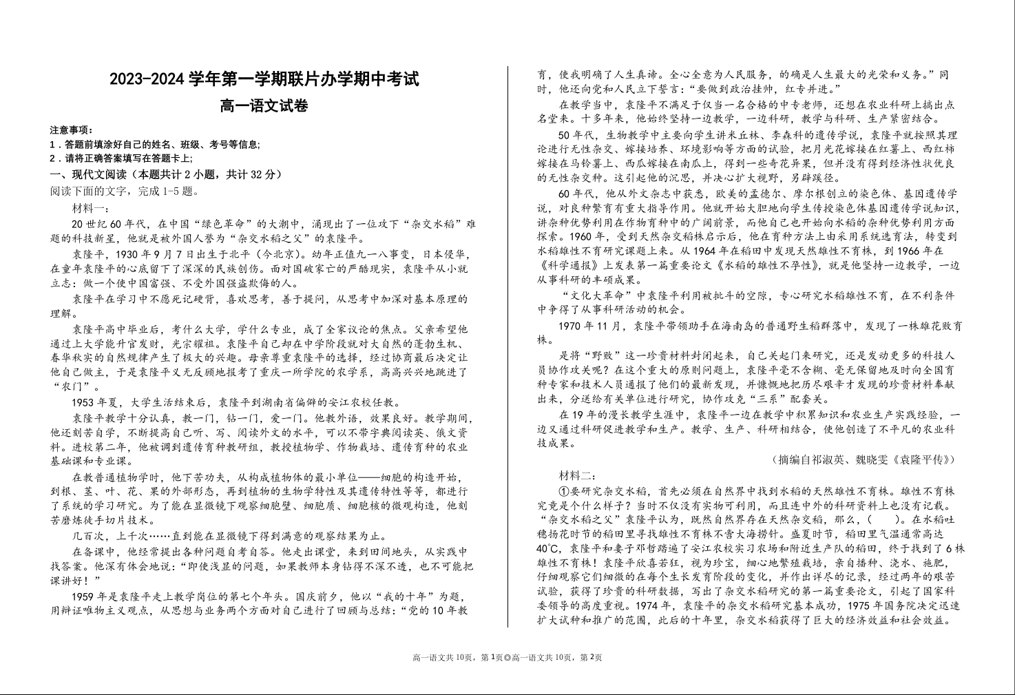 甘肃省兰州市教育局第四片区联考2023-2024学年高一上学期期中考试语文