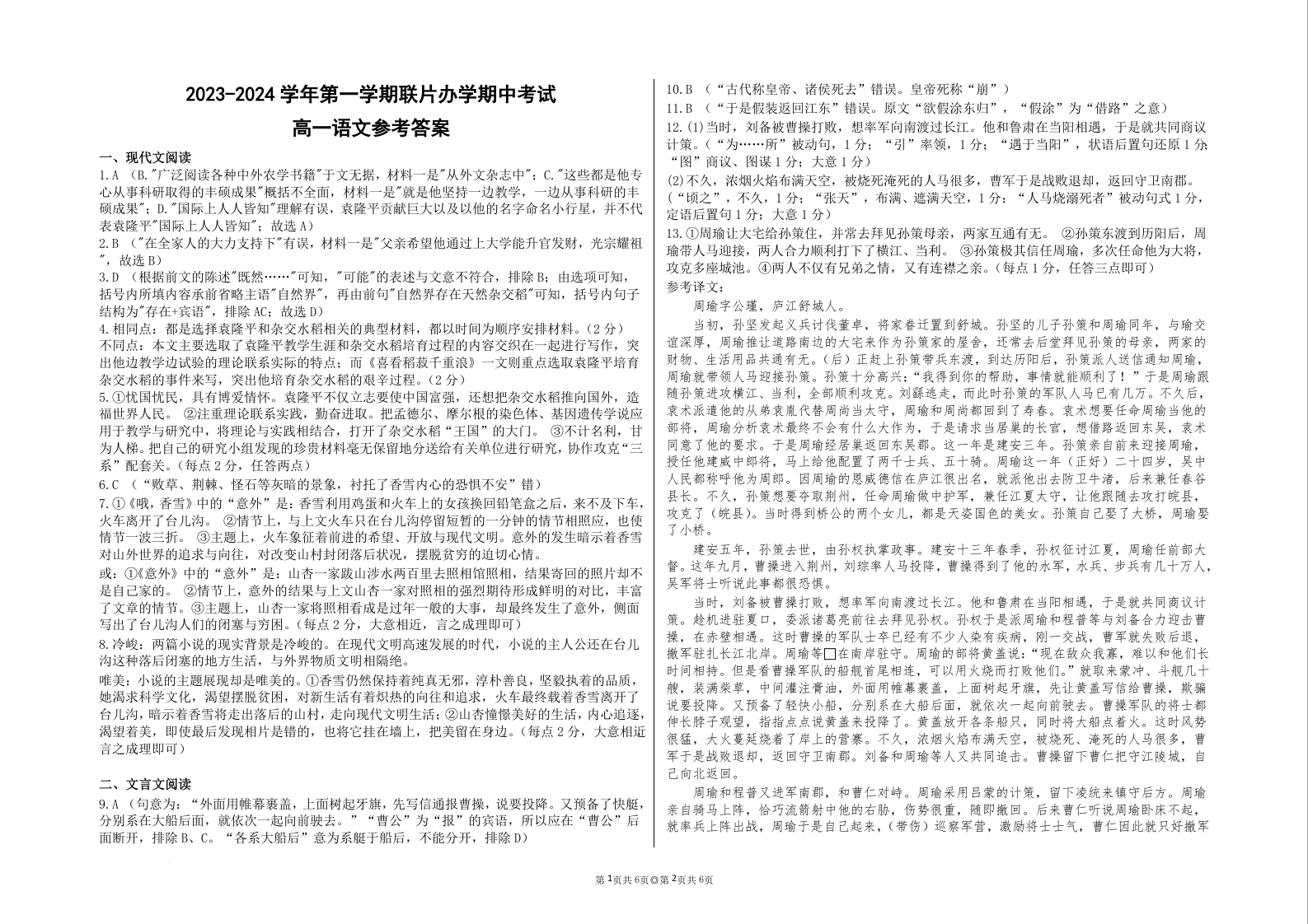 甘肃省兰州市教育局第四片区联考2023-2024学年高一上学期期中考试语文答案