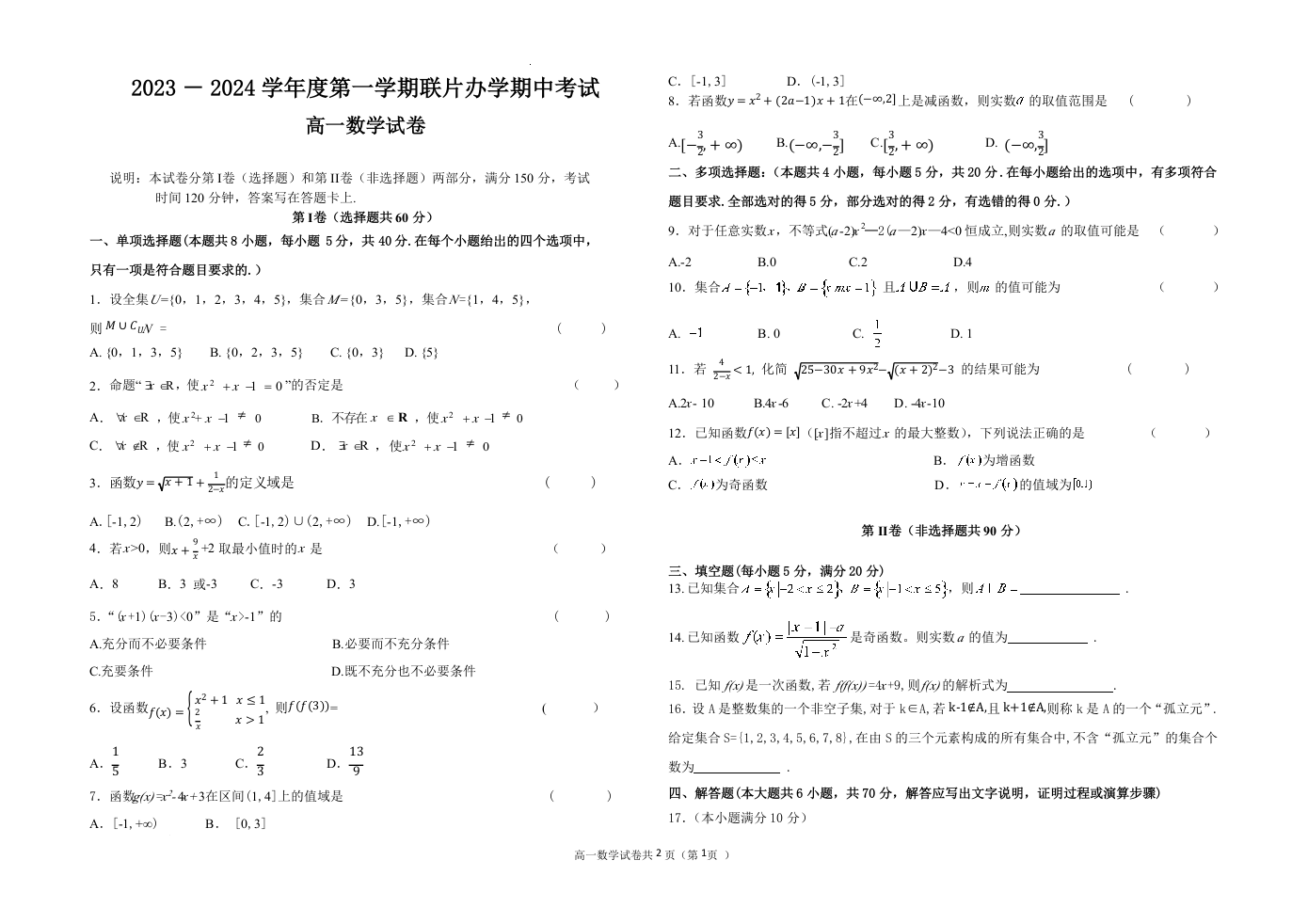 甘肃省兰州市教育局第四片区联考2023-2024学年高一上学期期中考试数学