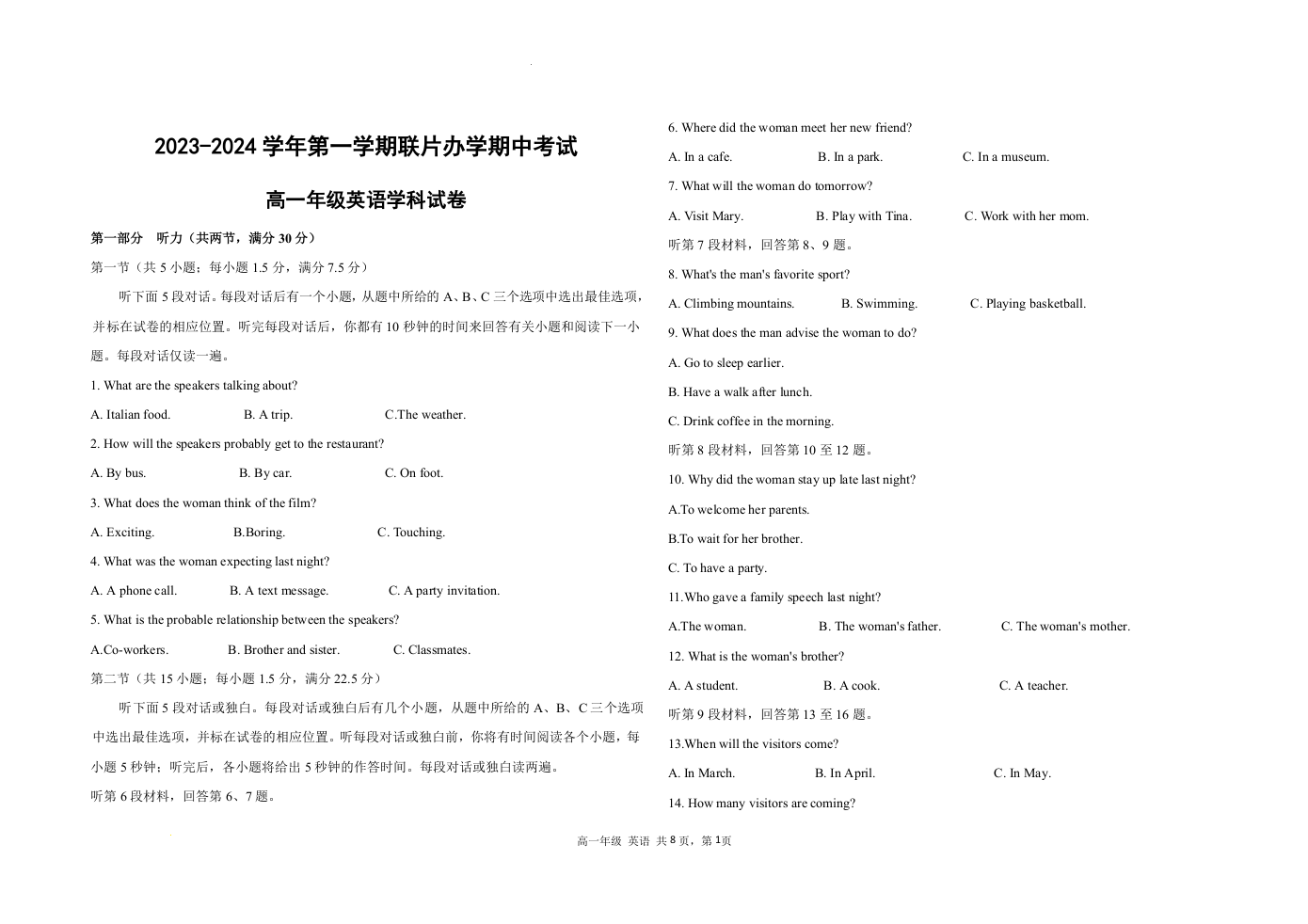 甘肃省兰州市教育局第四片区联考2023-2024学年高一上学期期中考试英语