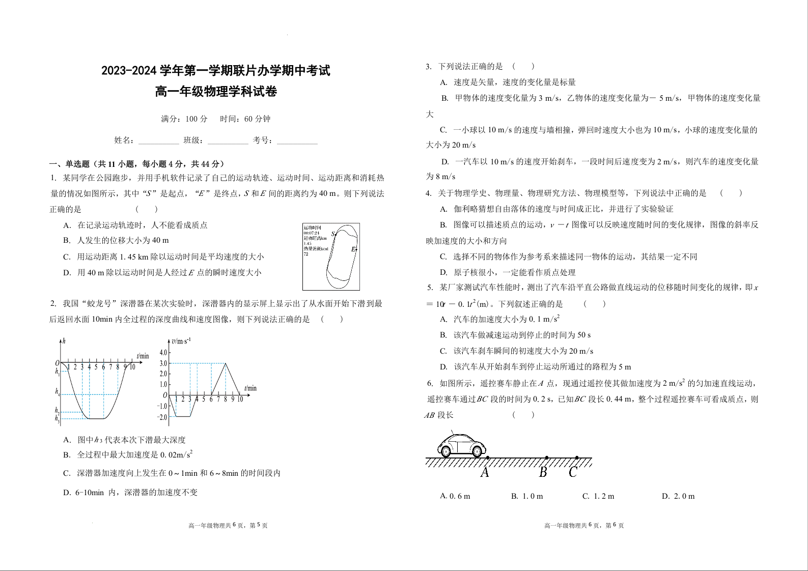 甘肃省兰州市教育局第四片区联考2023-2024学年高一上学期期中考试物理