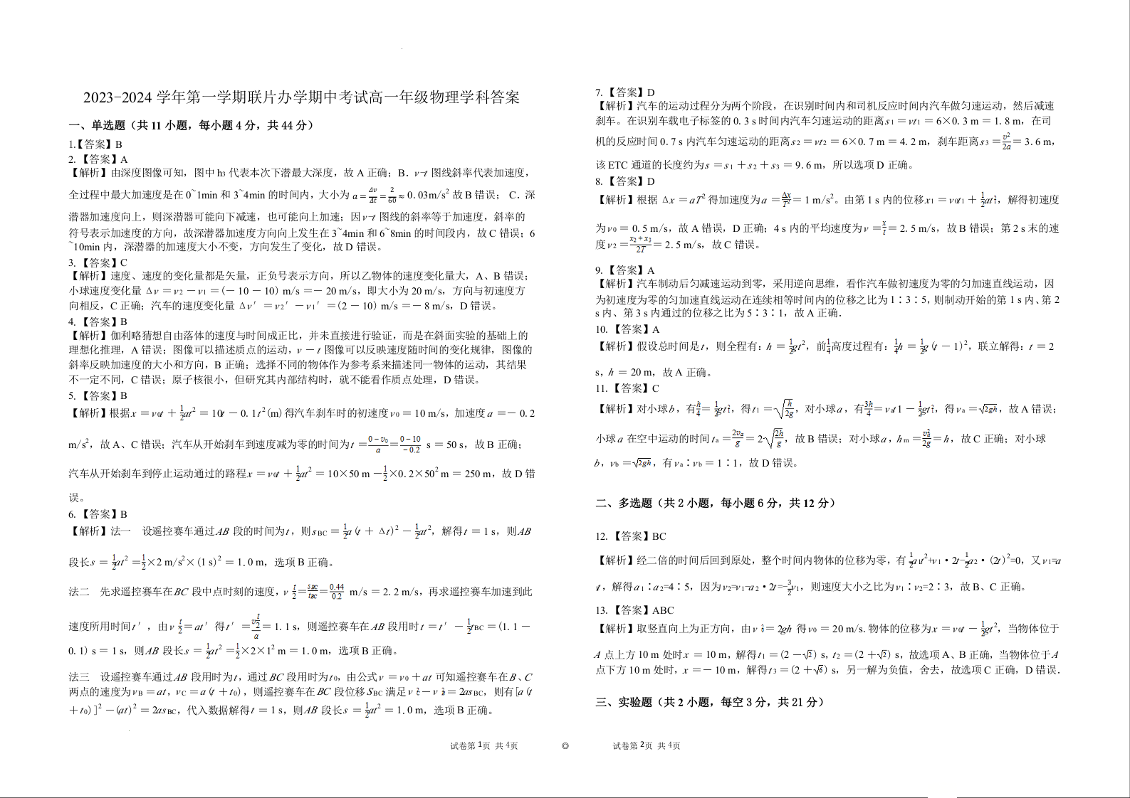 甘肃省兰州市教育局第四片区联考2023-2024学年高一上学期期中考试物理答案