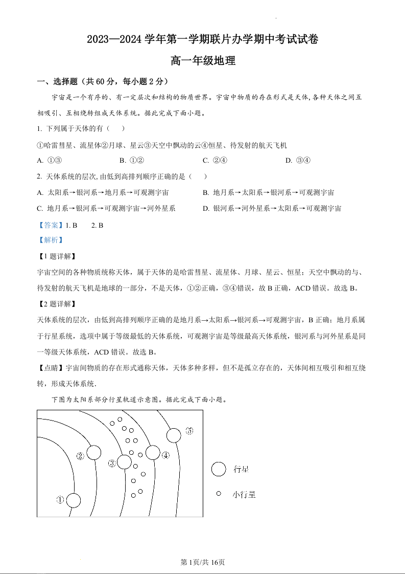 甘肃省兰州市教育局第四片区联考2023-2024学年高一上学期期中考试地理(精品解析版)