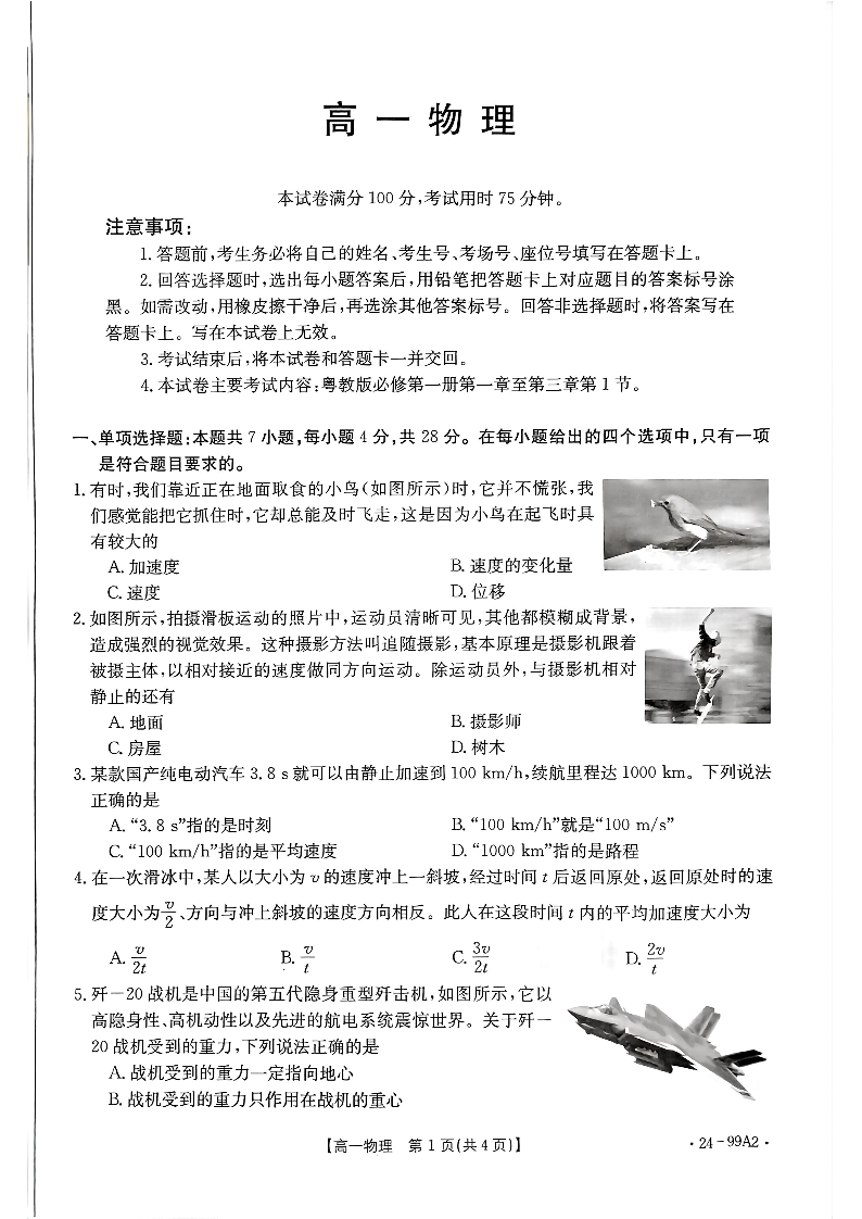 广东省湛江市2023-2024学年高一上学期期中考试物理