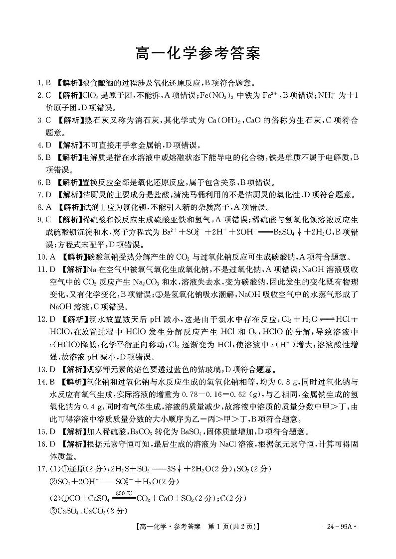 广东省湛江市2023-2024学年高一上学期期中考试化学答案