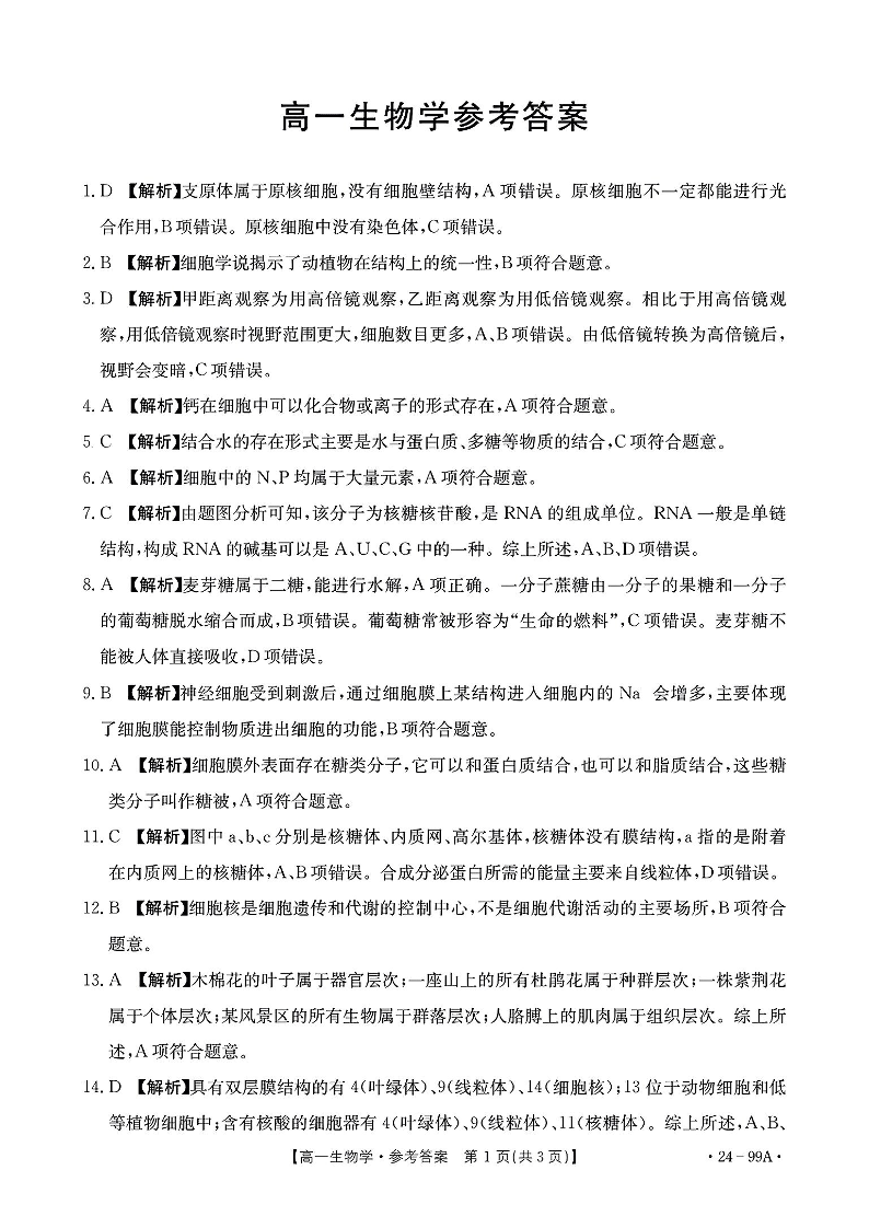 广东省湛江市2023-2024学年高一上学期期中考试生物答案