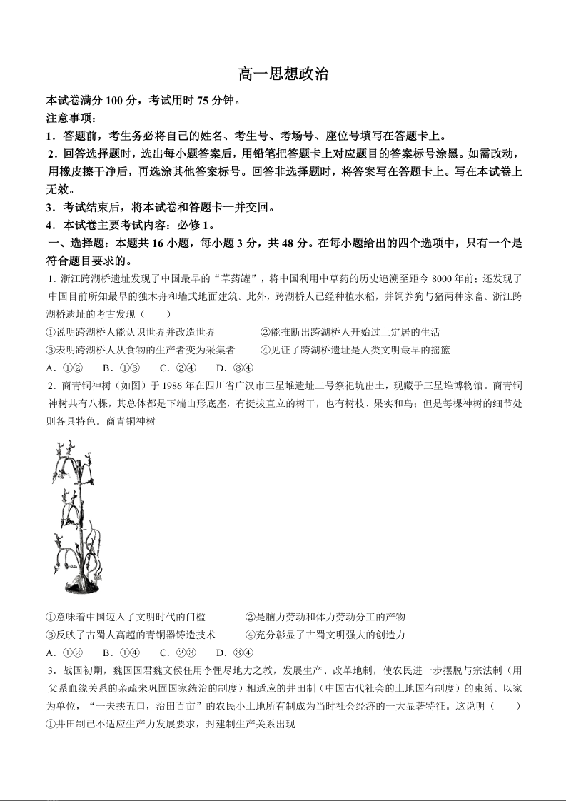 广东省湛江市2023-2024学年高一上学期期中考试政治