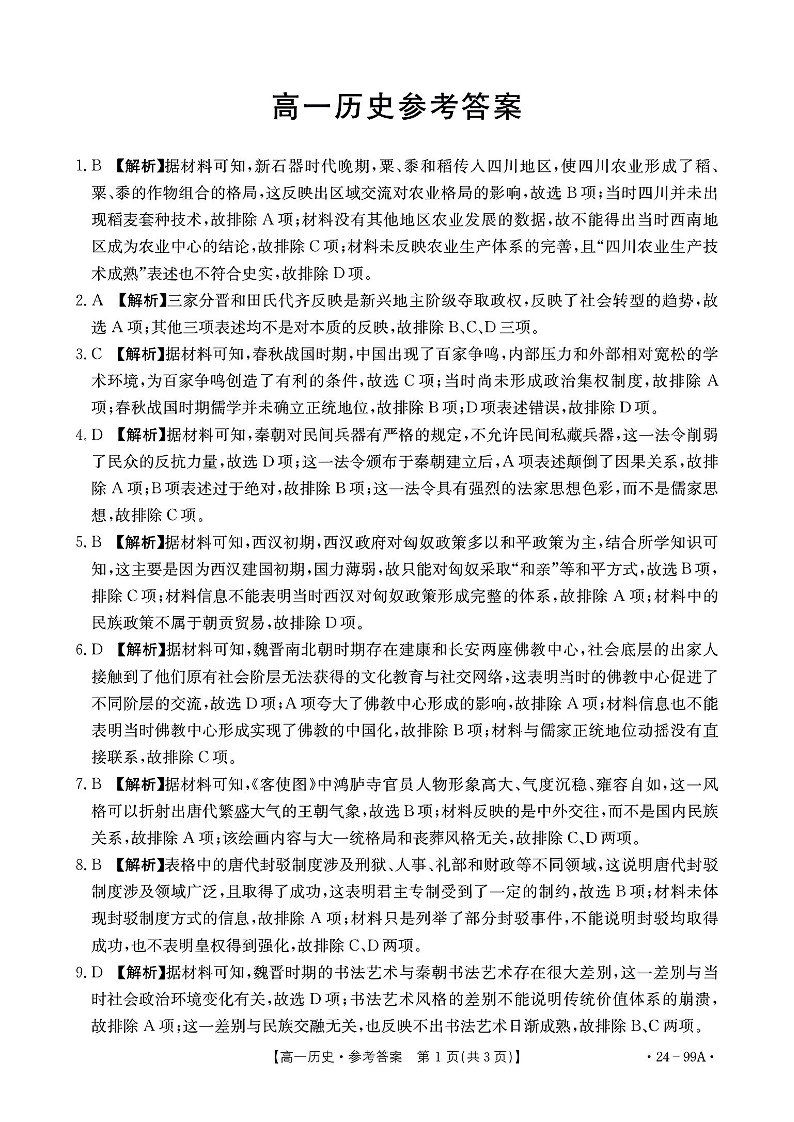 广东省湛江市2023-2024学年高一上学期期中考试历史答案