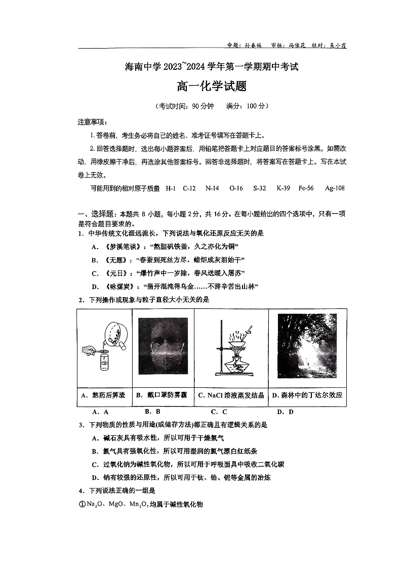 海南省海口市海南中学2023-2024学年高一上学期11月期中考试化学