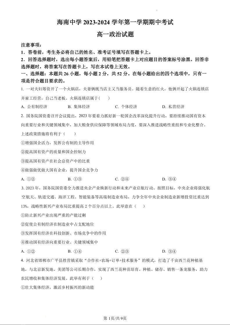 海南省海口市海南中学2023-2024学年高一上学期11月期中考试政治(原卷版)