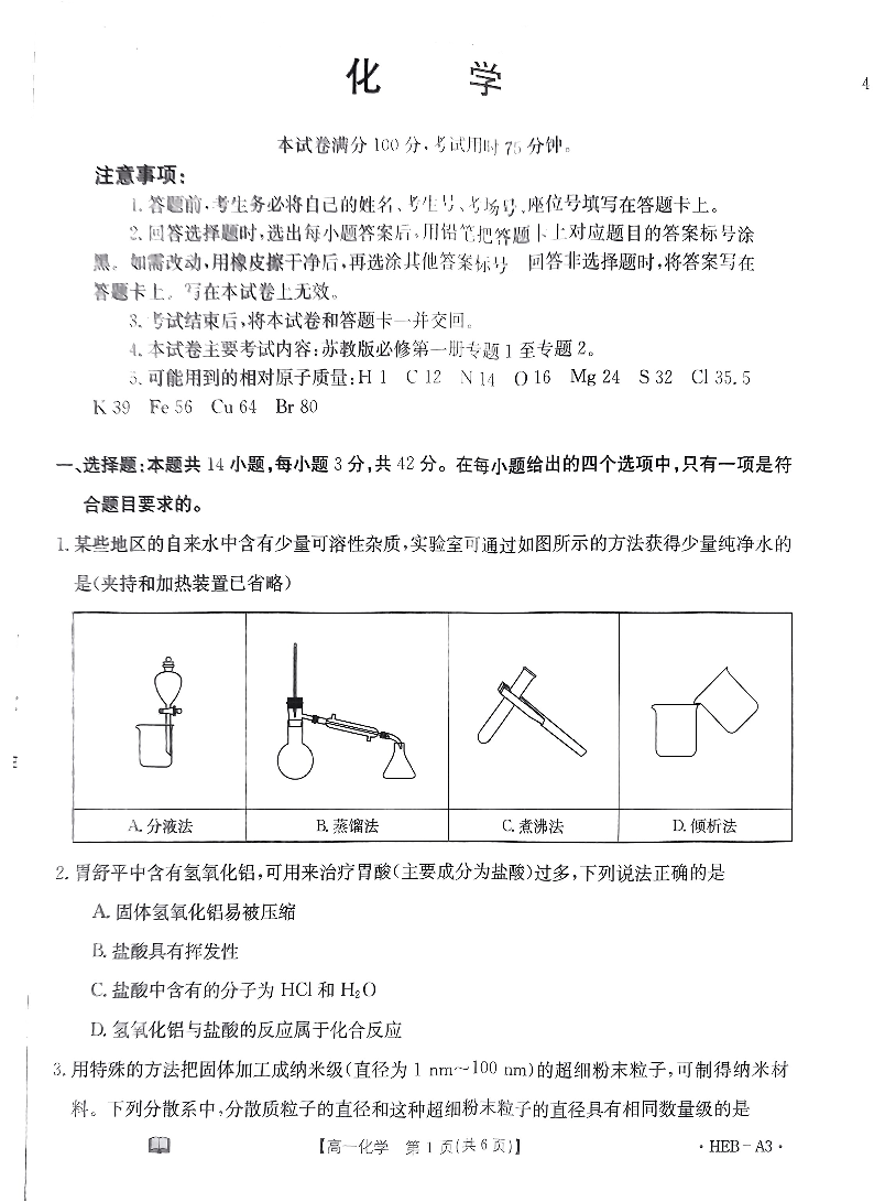河北省保定市部分重点高中2023-2024学年高一上学期11月期中考试化学