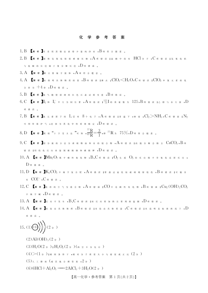 河北省保定市部分重点高中2023-2024学年高一上学期11月期中考试化学答案