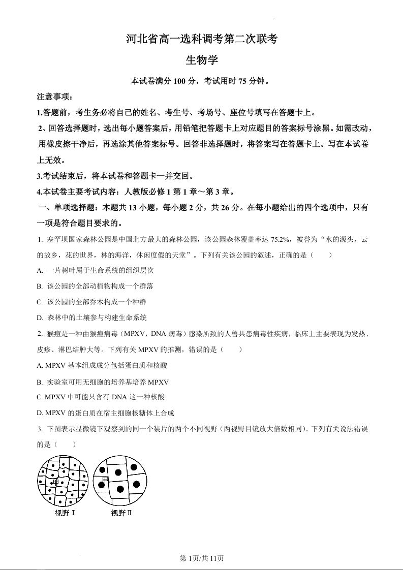 河北省保定市部分重点高中2023-2024学年高一上学期11月期中考试生物+答案