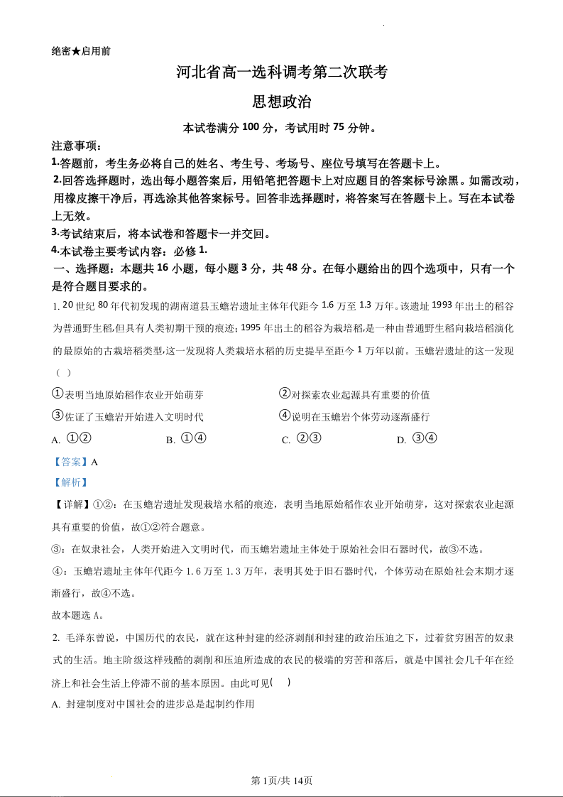 河北省保定市部分重点高中2023-2024学年高一上学期11月期中考试政治(精品解析版)