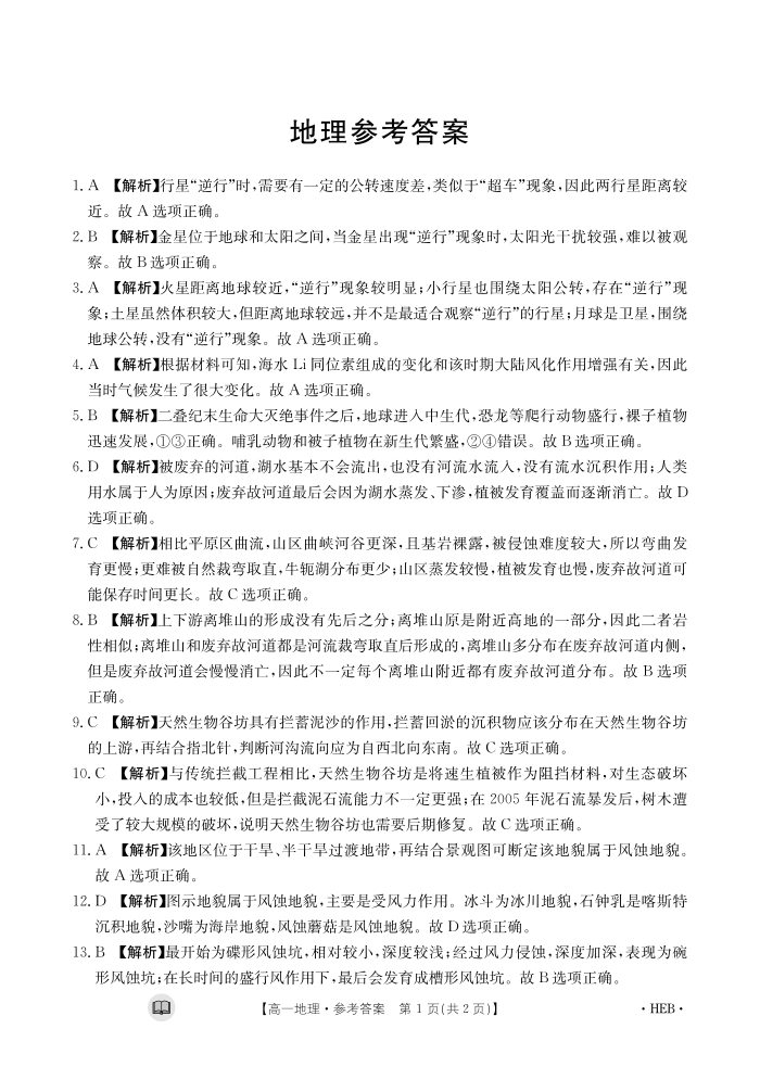 河北省保定市部分重点高中2023-2024学年高一上学期11月期中考试地理答案