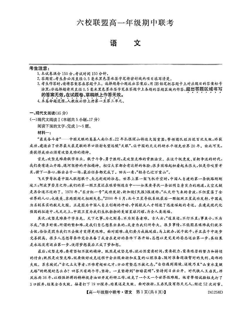 河北省保定市六校联考2023-2024学年高一上学期11月期中考试语文