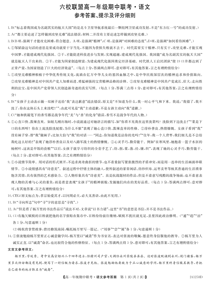 河北省保定市六校联考2023-2024学年高一上学期11月期中考试语文答案