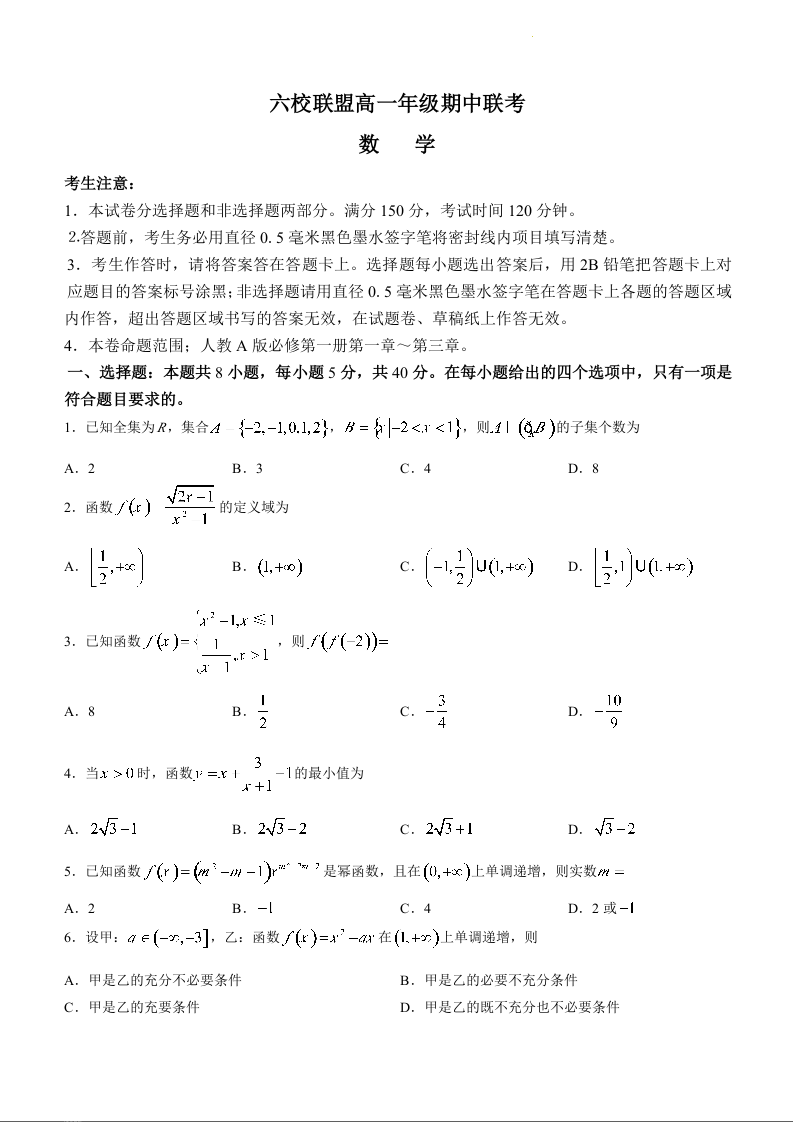 河北省保定市六校联考2023-2024学年高一上学期11月期中考试数学+答案