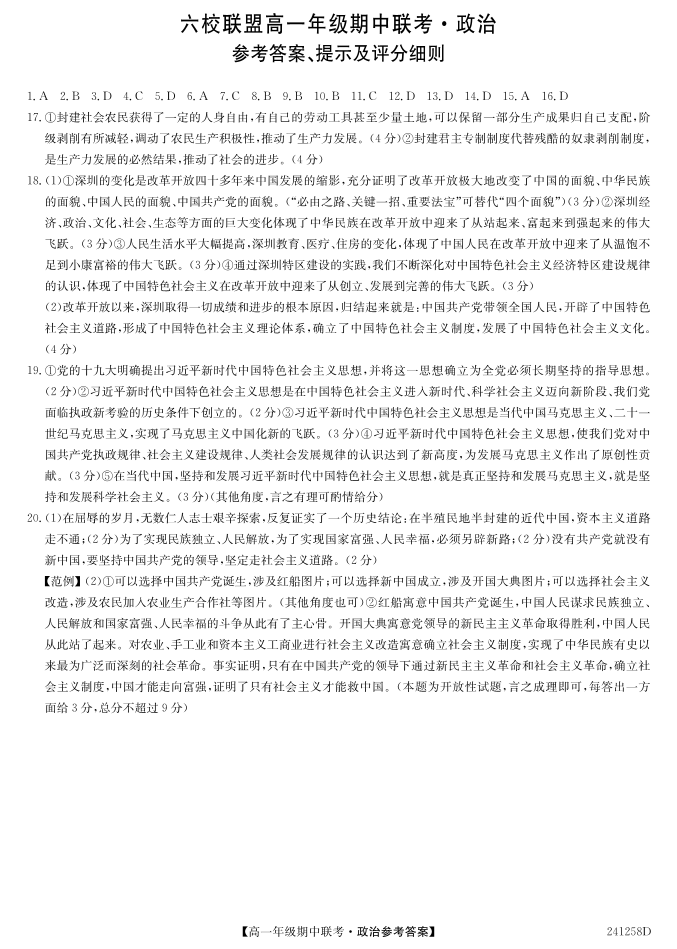 河北省保定市六校联考2023-2024学年高一上学期11月期中考试政治答案