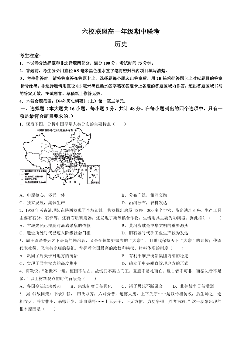 河北省保定市六校联考2023-2024学年高一上学期11月期中考试历史+答案