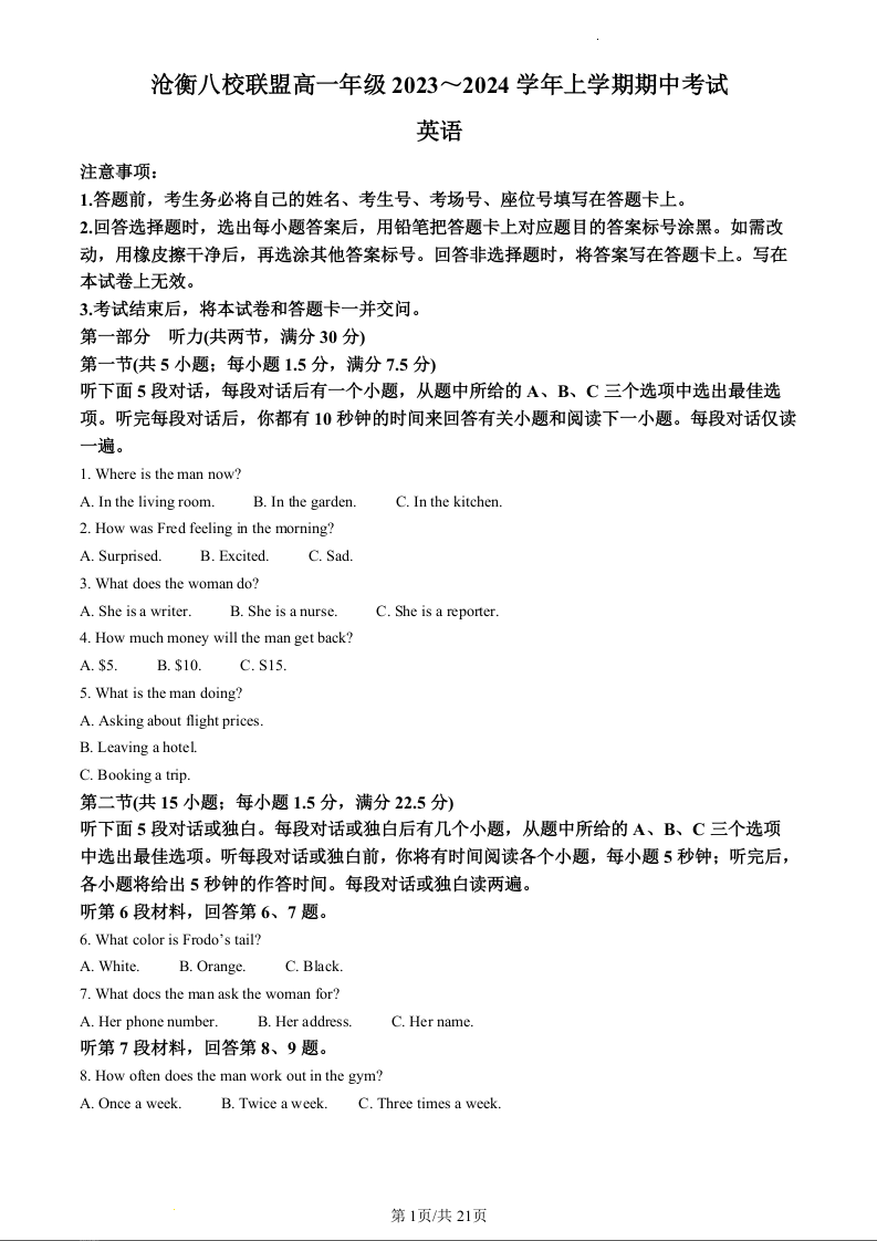 河北省沧衡八校联盟2023-2024学年高一上学期11月期中联考英语(精品解析版)