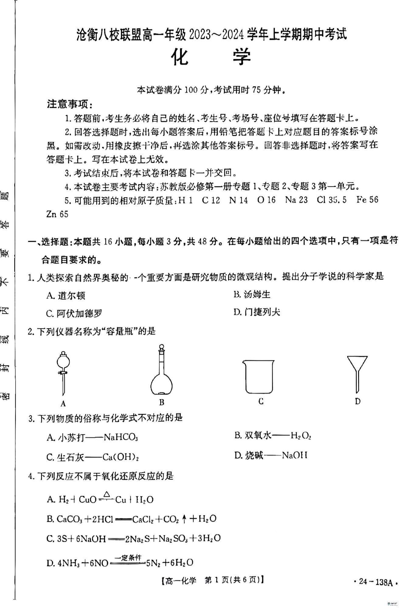 河北省沧衡八校联盟2023-2024学年高一上学期11月期中联考化学+答案
