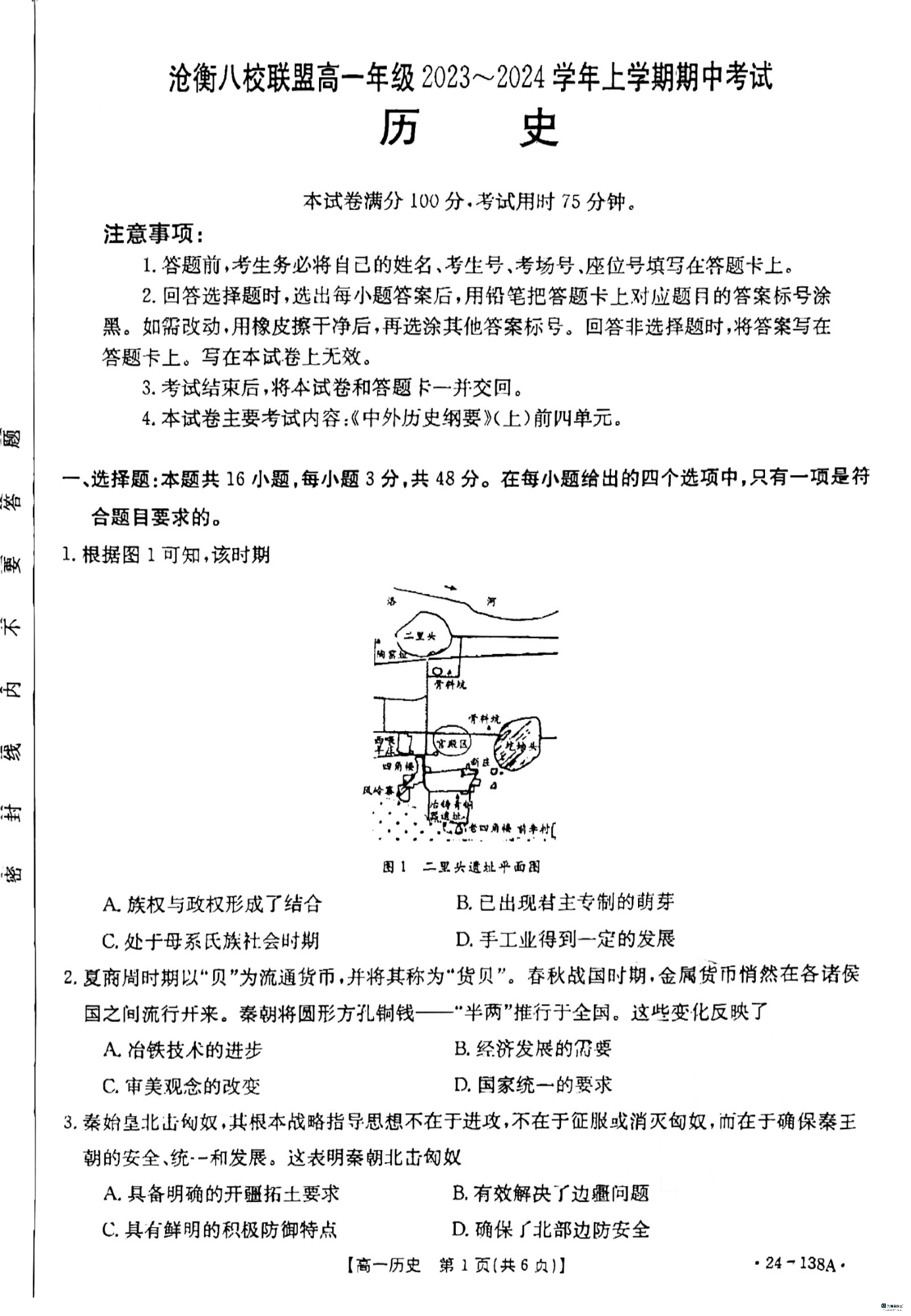 河北省沧衡八校联盟2023-2024学年高一上学期11月期中联考历史