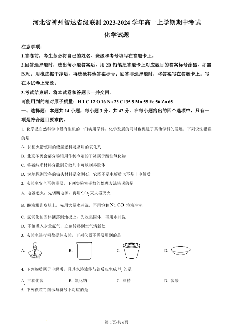 河北省沧州市2023-2024学年高一上学期11月期中考试化学(原卷版)