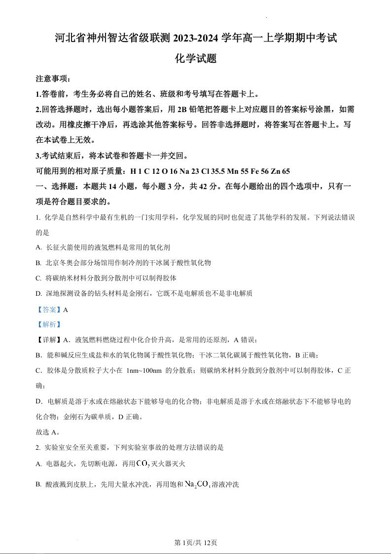 河北省沧州市2023-2024学年高一上学期11月期中考试化学(精品解析版)