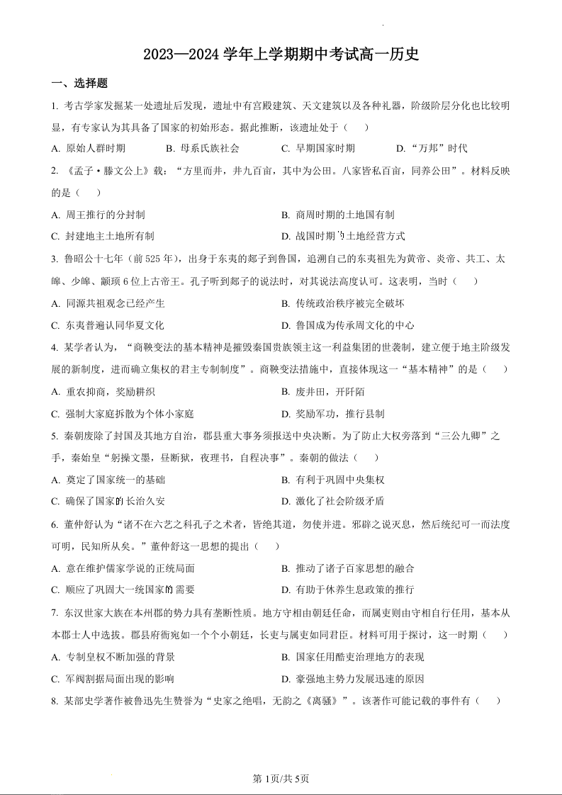 河北省沧州市2023-2024学年高一上学期11月期中考试历史(原卷版)
