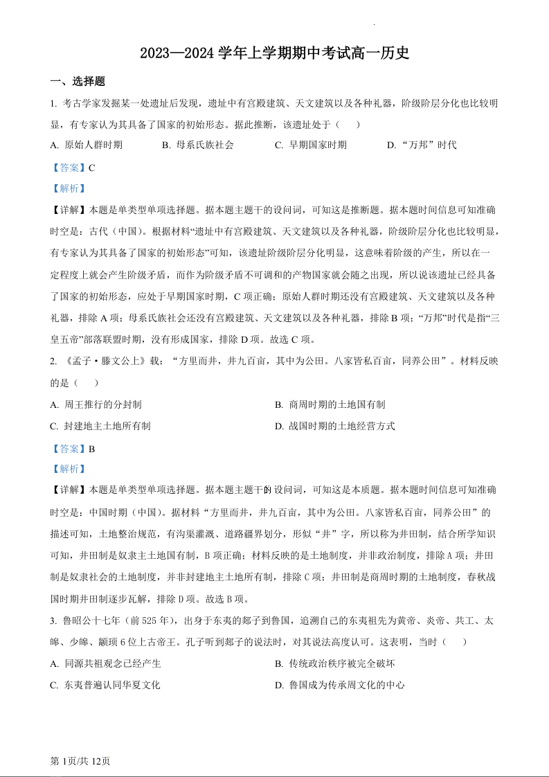 河北省沧州市2023-2024学年高一上学期11月期中考试历史(精品解析版)