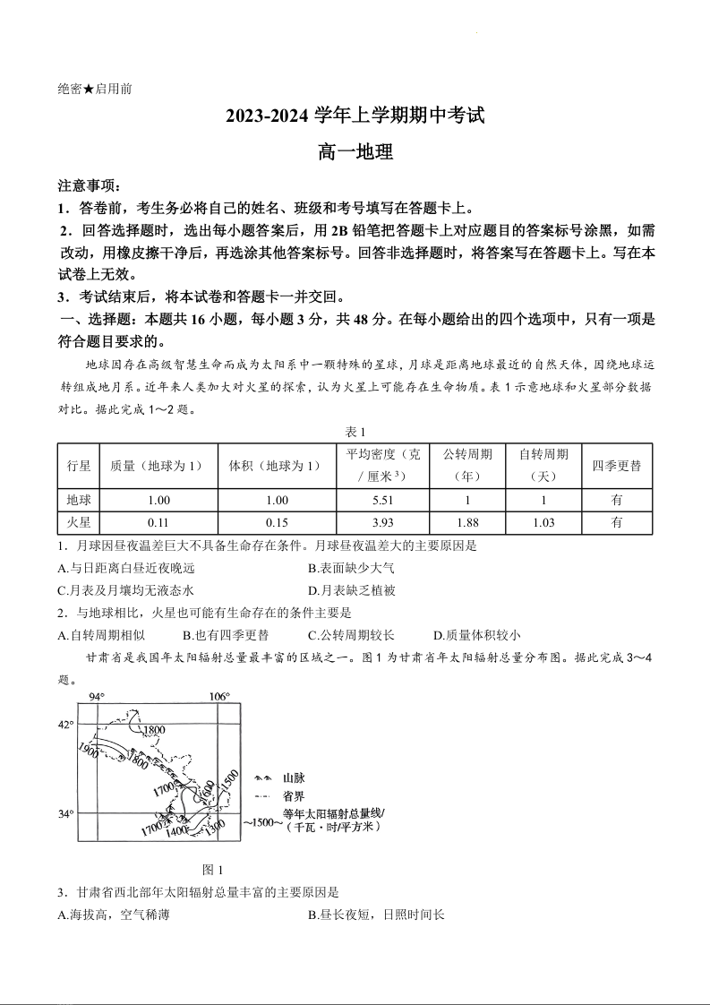 河北省沧州市2023-2024学年高一上学期11月期中考试地理
