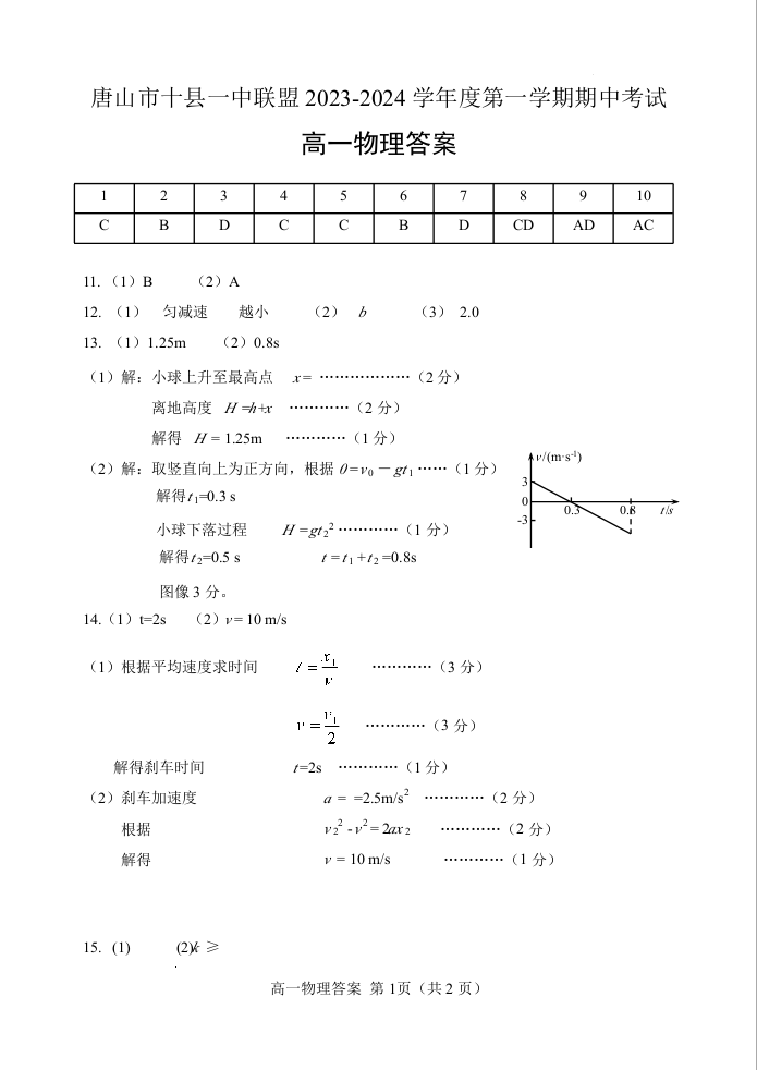 河北省唐山市十县一中联盟2023-2024学年高一上学期11月期中考试物理答案