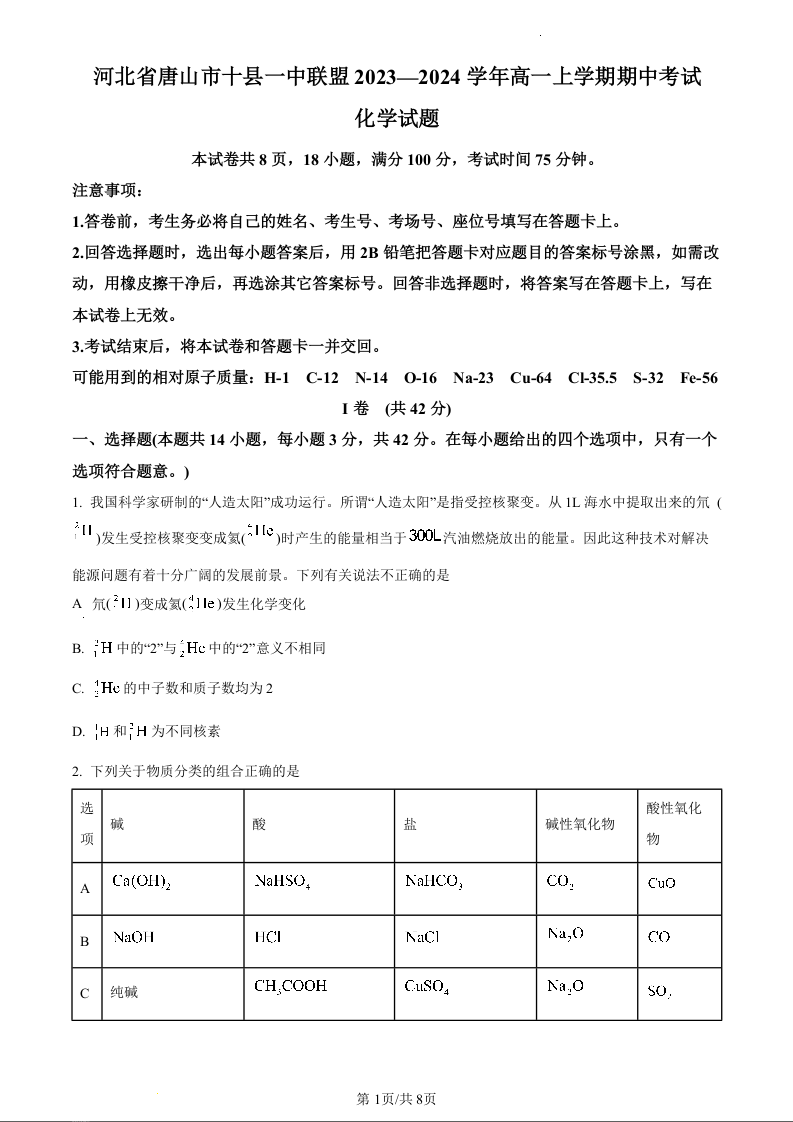 河北省唐山市十县一中联盟2023-2024学年高一上学期11月期中考试化学(原卷版)
