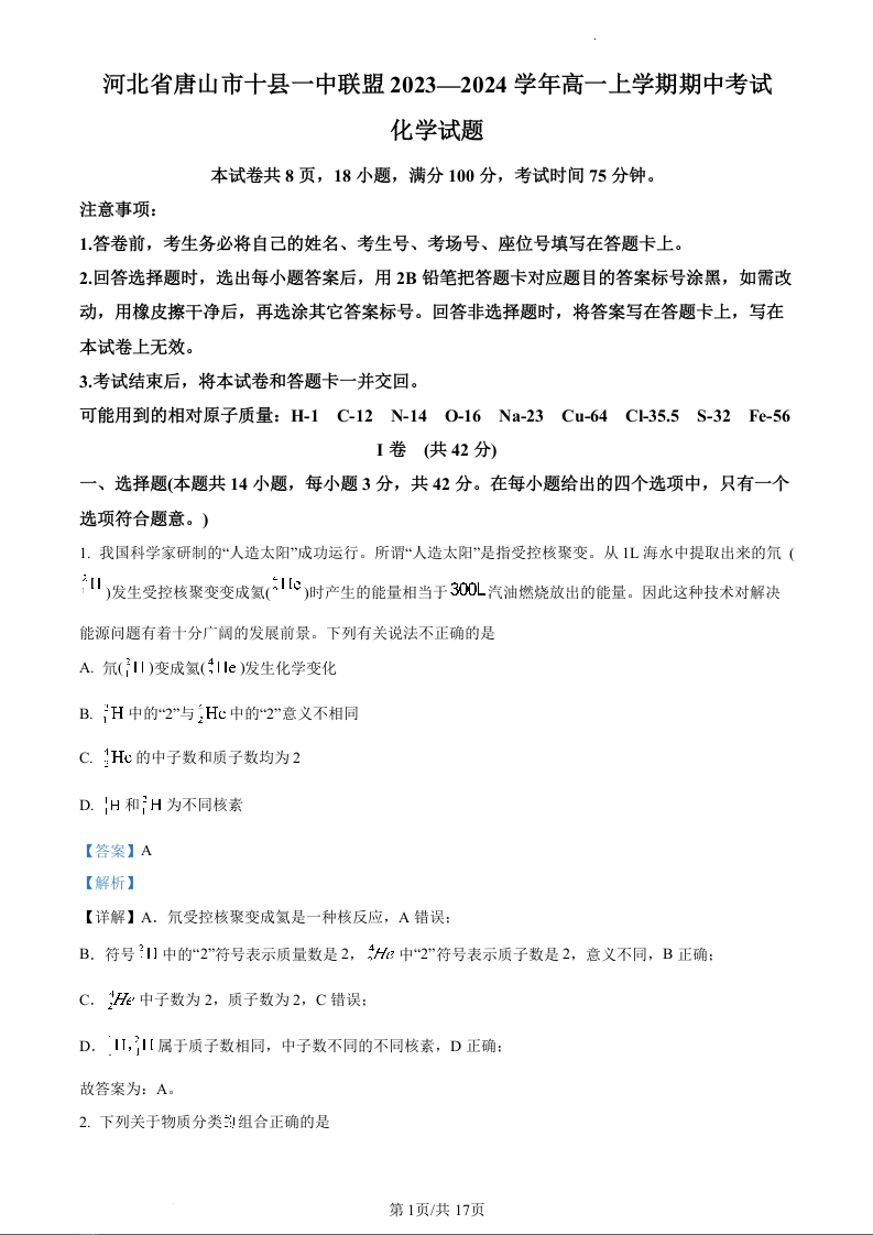 河北省唐山市十县一中联盟2023-2024学年高一上学期11月期中考试化学(精品解析版)