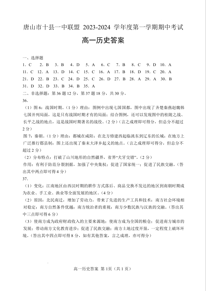河北省唐山市十县一中联盟2023-2024学年高一上学期11月期中考试历史答案
