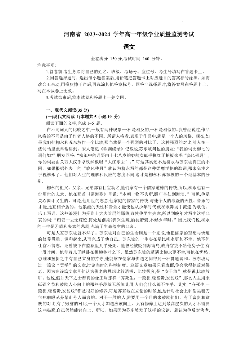 河南省八地市2023-2024学年高一上学期期中联考语文
