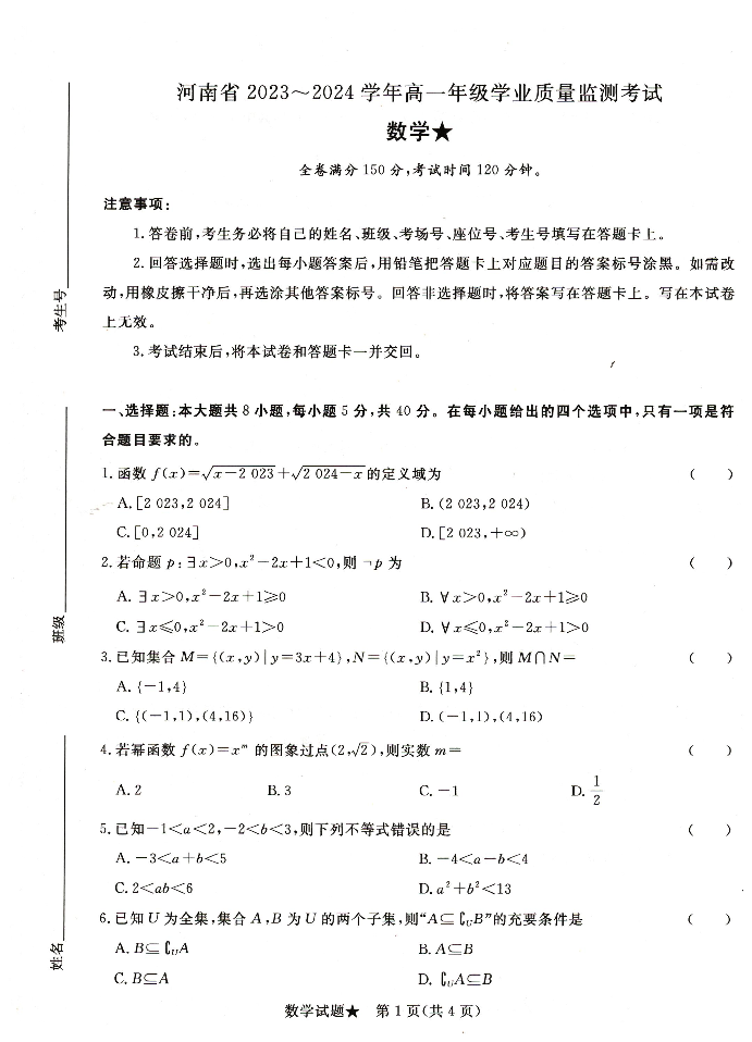 河南省八地市2023-2024学年高一上学期期中联考数学