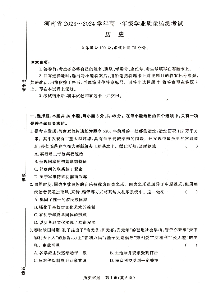 河南省八地市2023-2024学年高一上学期期中联考历史