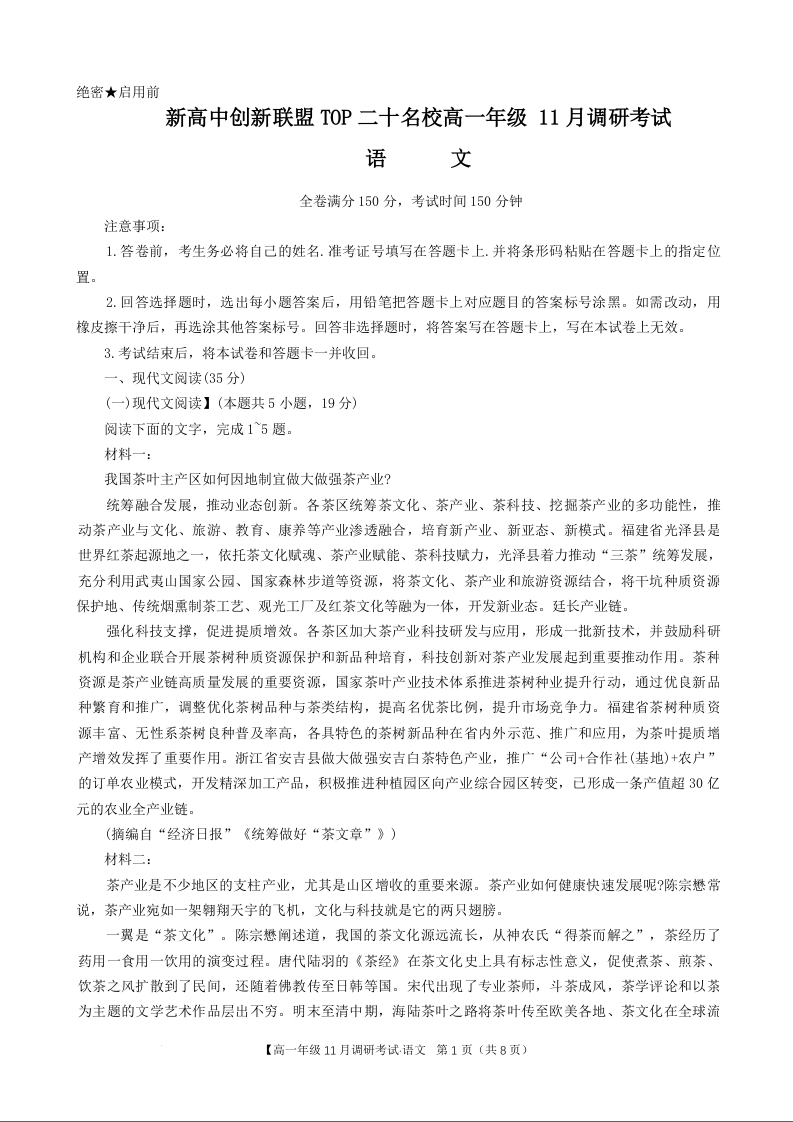 河南省新高中创新联盟TOP二十名校2023-2024学年高一上学期11月调研考试语文