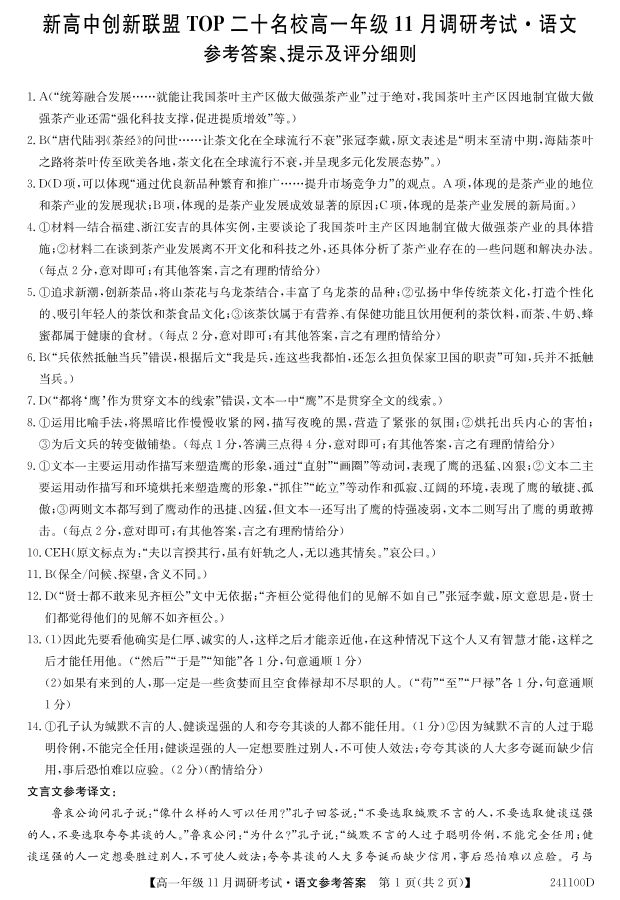 河南省新高中创新联盟TOP二十名校2023-2024学年高一上学期11月调研考试语文答案