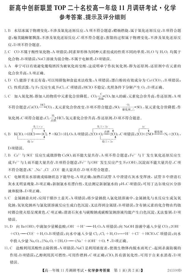 河南省新高中创新联盟TOP二十名校2023-2024学年高一上学期11月调研考试化学答案