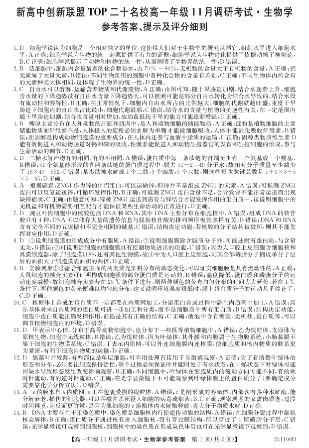 河南省新高中创新联盟TOP二十名校2023-2024学年高一上学期11月调研考试生物答案