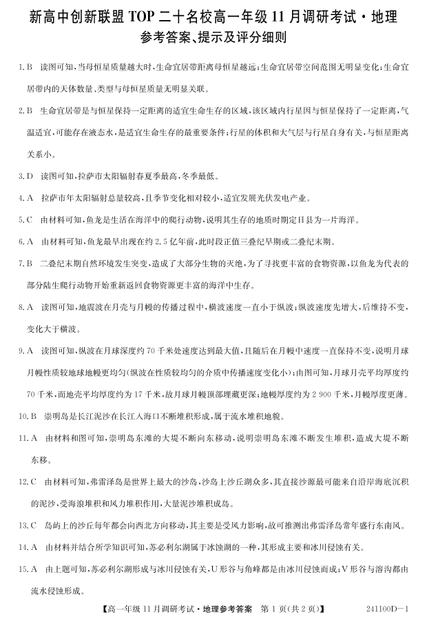 河南省新高中创新联盟TOP二十名校2023-2024学年高一上学期11月调研考试地理答案